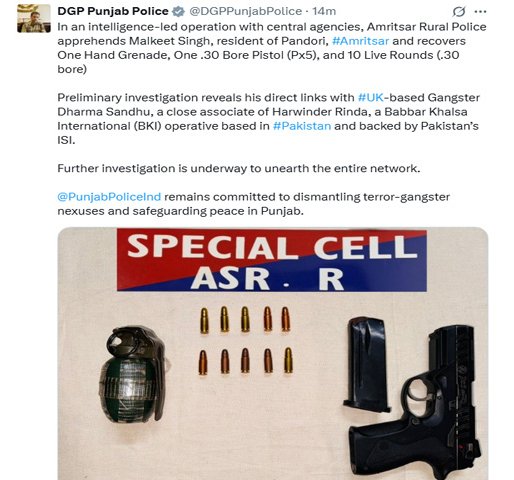 चंडीगढ़, (अमृतसर) (वीकेंड रिपोर्ट) Big success of Amritsar police : पंजाब पुलिस ने केंद्रीय एजेंसियों से प्राप्त खुफिया जानकारी के आधार पर अमृतसर में चलाए गए विशेष अभियान के दौरान पंडोरी निवासी मलकीत सिंह को हथियारों के साथ गिरफ्तार किया है। इस गिरफ्तारी में एक हथगोला, एक 30 बोर पिस्तौल और 10 ज़िंदा कारतूस बरामद हुए हैं।