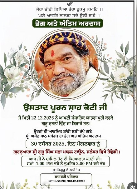 जालंधर (वीकैंड रिपोर्ट)– Ustad Puran Shah Koti Antim Ardas: उस्ताद पूरण शाह कोटी जिनका 22 दिसंबर को निधऩ हो गया था, उनकी आत्मिक शांति के लिए श्री अखंड पाठ साहिब का भोग एवं अंतिम अरदास 30 दिसंबर दिन मंगलवार को गुरुद्वारा श्री गुरु सिंह सभा, माडल टाऊन में होगा। शाहकोटी परिवार ने अपने शुभचिंतकों से अपील की है कि वे दोपहर 1 बजे तक गुरुद्वारा श्री गुरु सिंह सभा में पहुंच जाएं। उल्लेखनीय है कि मशहूर गायक मास्टर सलीम के पिता उस्ताद पूरण शाह कोटी का निधन संगीत जगत के लिए अपूरणीय क्षति है।