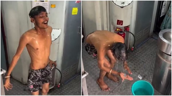 शख्स को नहाते हुए ट्रेन के कोच में मौजूद सभी लोग देख रहे हैं. सबके देखने के बावजूद भी इस व्यक्ति को कोई फर्क नहीं पड़ रहा और यह बेहद ही मस्ती भरे अंदाज में नहा रहा है। इस वीडियो को ट्रेन में बैठे यात्रियों ने रिकॉर्ड किया है। बताया जाता है कि रेलवे ने इस शख्स की पहचान कर ली है और जल्द ही इसके खिलाफ कड़ा एक्शन लिया जाएगा।