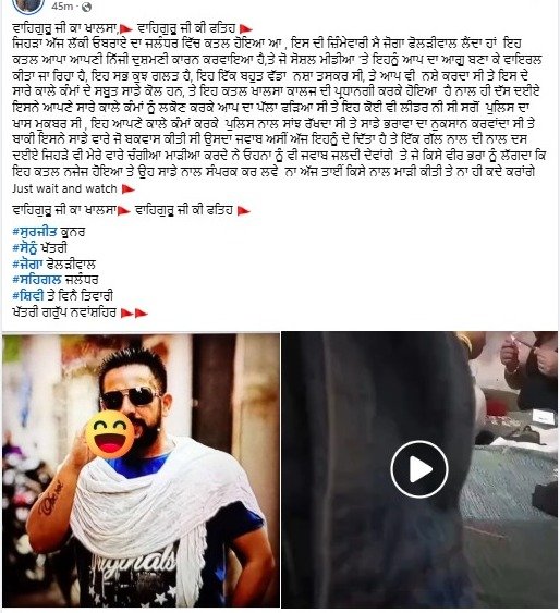 इस बीच Joga Pholriwal नामक व्यक्ति द्वारा हत्या की जिम्मेदारी लेने की एक पोस्ट सामने आई है। हालांकि पुलिस ने अभी आधिकारिक पुष्टि नहीं की है और मामले की जांच जारी है। घटना की सूचना मिलते ही एसपी हरिंदर सिंह गिल और एडीसीपी-2 जालंधर पुलिस टीम के साथ मौके पर पहुंचे और साक्ष्य जुटाने शुरू कर दिए।