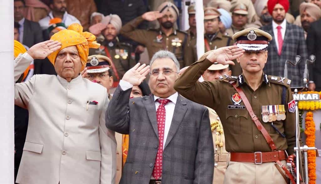 जालंधर (वीकैंड रिपोर्ट) : 74th Republic Day : पंजाब के राज्यपाल बनवारी लाल पुरोहित ने आज यहां 74वें गणतंत्र दिवस के अवसर पर राष्ट्रीय ध्वज फहराने के बाद अपने संदेश में संविधान की महत्ता के बारे में बात करते हुए कहा कि प्रत्येक नागरिक को संवैधानिक कर्तव्यों के प्रति पूरी तरह जागरूक होना चाहिए , संविधान की उल्लंघन करने वालों के खिलाफ कार्रवाई की जाए। पंजाब के लोगों को राज्य के शासन- प्रशासन मजबूत करने, राज्य के विकास और समृद्धि में सक्रिय भागीदार बनने का आग्रह करते हुए, राज्यपाल बनवारी लाल पुरोहित ने विश्वास व्यक्त किया कि राज्य के लोग अपना उचित योगदान देकर पंजाब की प्रगति के लिए एक नई मिसाल पेश करेंगे।