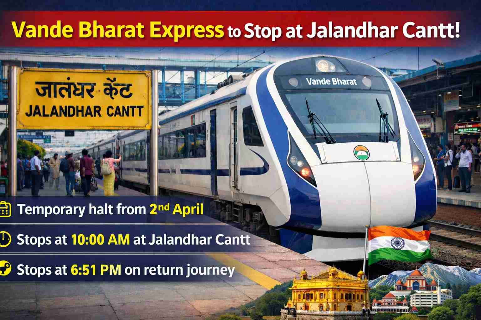कटरा/पठानकोट से लौटते समय यह ट्रेन शाम 5:29 बजे पठानकोट से चलकर 6:51 बजे जालंधर कैंट पहुंचेगी और 6:53 बजे लुधियाना के लिए प्रस्थान करेगी। इस फैसले से जालंधर और आसपास के इलाकों के यात्रियों को बड़ी सुविधा मिलेगी, क्योंकि लंबे समय से वंदे भारत एक्सप्रेस के ठहराव की मांग की जा रही थी।