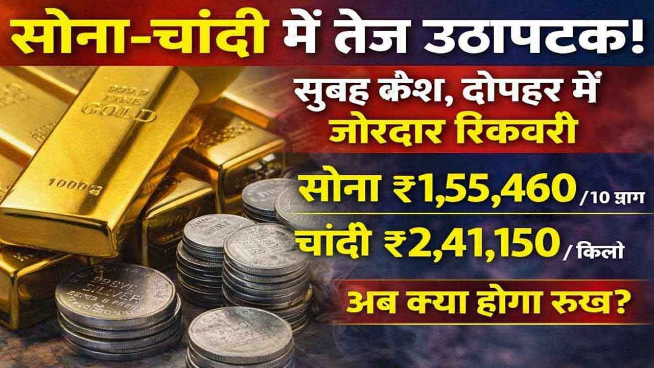 एमसीएक्स पर सोना सुबह गिरकर ₹1,54,248 प्रति 10 ग्राम के निचले स्तर तक पहुंच गया था। लेकिन बाद में इसमें लगभग ₹1,212 की तेजी आई और दोपहर तक भाव ₹1,55,460 प्रति 10 ग्राम पर पहुंच गया। चांदी में उतार-चढ़ाव और भी ज्यादा तेज रहा। सुबह चांदी ₹2,35,624 प्रति किलो तक लुढ़क गई थी, लेकिन दोपहर 1:33 बजे तक यह तेज उछाल के साथ ₹2,41,150 प्रति किलो के स्तर पर पहुंच गई।
